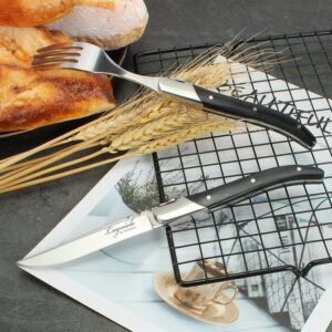 This Laguiole black handle steak knife and fork set combines traditional French craftsmanship with modern minimalist design to provide exquisite tableware for high-end dining venues. Each set includes a steak knife and fork, with high-quality stainless steel blades to ensure its sharpness and durability, and can easily handle the cutting of steaks and other meats. The black handle design is simple and modern, providing a comfortable grip while adding to the elegance of the tableware, suitable for a variety of dining occasions.