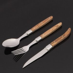 This Laguiole olive wood handle cutlery set is a perfect interpretation of classic French craftsmanship and modern design. Each set includes a steak knife, fork and spoon. The olive wood handle of each cutlery has its natural texture and color, giving the cutlery a unique charm, showing a combination of naturalness and elegance. The blade is made of high-quality stainless steel, sharp and durable, ensuring a smooth cutting experience. Its handle is ergonomically designed to provide a comfortable grip, suitable for long-term use, and enhance the pleasure of dining.